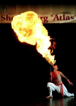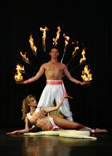 Balance auf scharfen Schwertern, Saltos über Scherben - eine atemberaubende spannungsgeladene Darbietung, die Elemente der Fakire mit Artistik zeitgemäß mit der Modernen vereint. Jahrelange nationale und internationale Erfahrungen machen diese Show immer wieder zu einem Erlebnis für das Publikum.